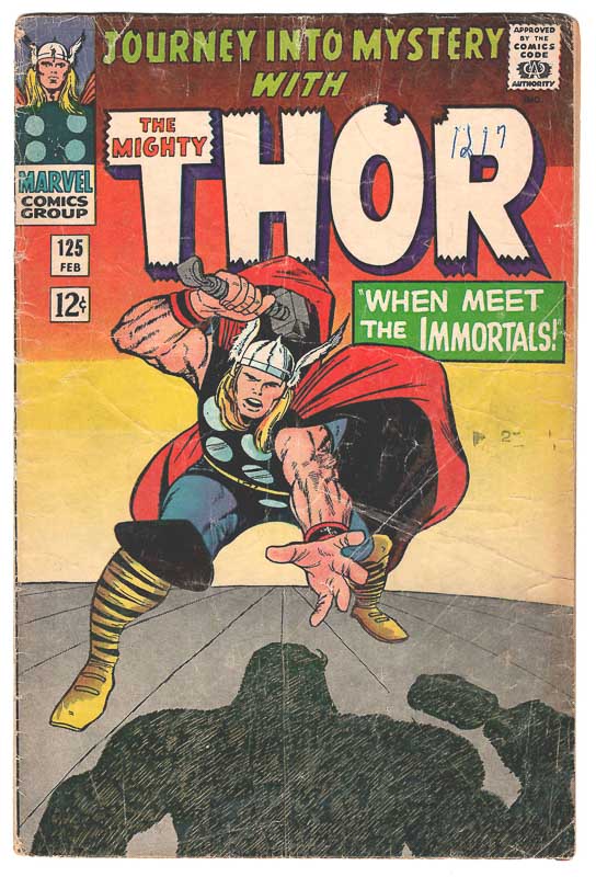 This is a vintage 1966 Thor #125, produced by Marvel Comics. The book would grade a Good condition with healthy amount of damage preventing any higher grade. The name John Cota stamped on the inside page with off white interior pages.